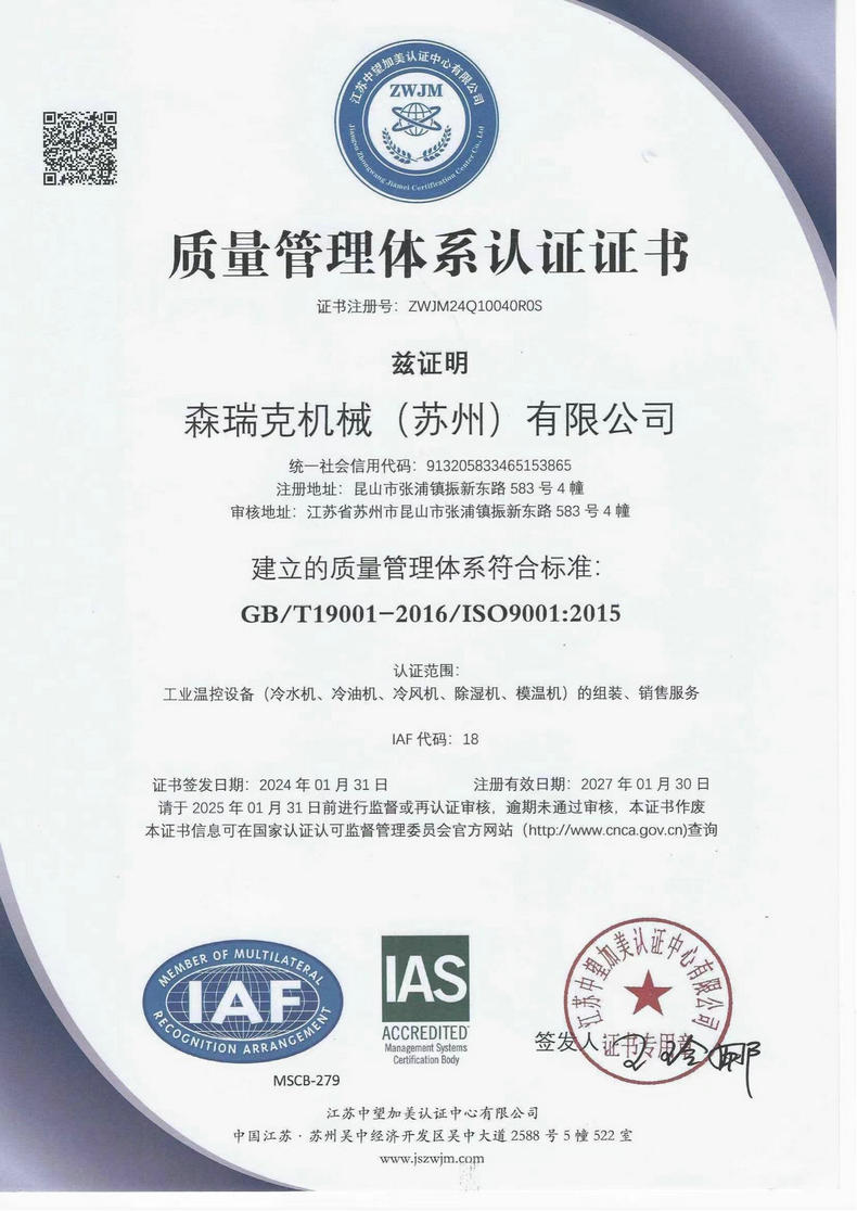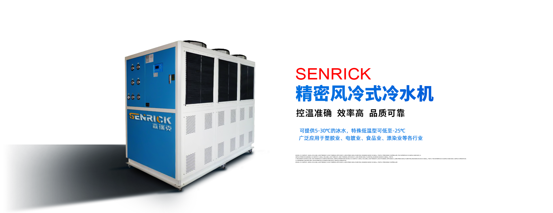 森瑞克機(jī)械(蘇州)有限公司(簡(jiǎn)稱(chēng):SENRICK)是一家中外合作性企業(yè),引進(jìn)技術(shù),專(zhuān)注于工業(yè)制冷設(shè)備,工業(yè)溫控設(shè)備,非標(biāo)制冷設(shè)備,集激光,化工,真空設(shè)備輔機(jī)等集研發(fā)、生產(chǎn)、銷(xiāo)售、服務(wù)于一體的的現(xiàn)代化科技企業(yè)。公司擁有完善的制造設(shè)備,先進(jìn)的檢測(cè)系統(tǒng),獨(dú)立的加工、生產(chǎn)工藝,一支開(kāi)拓創(chuàng)新專(zhuān)業(yè)有素的技術(shù)人才團(tuán)隊(duì),以及全面的質(zhì)量控制體系,為產(chǎn)品質(zhì)量的不斷優(yōu)化提供了強(qiáng)大的保障,以確保滿(mǎn)足不同市場(chǎng)的各種需求。經(jīng)過(guò)多年的努力企業(yè)相繼研發(fā)生產(chǎn)出了工業(yè)冷水機(jī),工業(yè)冷風(fēng)機(jī),工業(yè)冷油機(jī),工業(yè)機(jī),低溫冷水機(jī),低溫冷風(fēng)機(jī),低溫冷油機(jī),螺桿式冷水機(jī)...